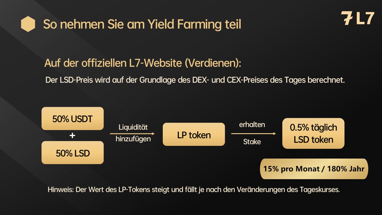 L7 gibt Dir die Möglichkeit, durch die Bereitstellung von Liquidität am sogenannten Yield – Farming teilzuhaben. Hier kannst Du tägliche Erträge von 0,5% – 0,8% in BTC, ETH, SOL…LSD Token uvm. erzielen. Es gibt hier zahlreiche Möglichkeiten für Investoren um profitable Renditen zu erzielen. Die Erträge sind täglich direkt ins Metamask,Trust Wallet …uvm. auszahlbar.
